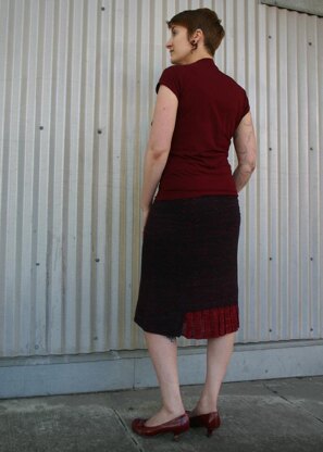 This skirt was inspired by architectural cross-section drawings showing hidden layers under the facade of a building, but it also brings to mind skirts from the early 1920s, when ladies’ calves were suddenly visible under shockingly (for the time) short skirts. The inset pleats add intriguing detail and movement to this very wearable skirt. Choose a yarn that has some stretch and memory so that your skirt will hold its shape.