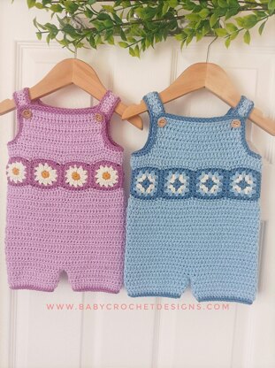 These cute little overalls are made with either mini daisy granny squares or mini granny squares, that are joined with a continuous join. Then making the top half and straps, then the bottom half. These are part of a daisy chain range including a dress, cardigan, sweater and romper coming soon!