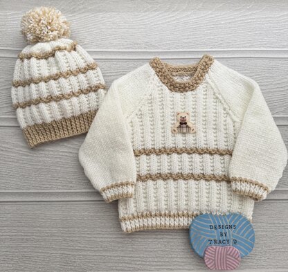 Danny is a unisex Baby Knitting Pattern for a simple raglan sleeve sweater/jumper and hat Sizes 18-22" chest. The 18''& 20" chest sizes are made using DK yarn with 3.25mm and 4mm needles and the 22" size is made following the 20" chest size pattern but using 3.75mm and 4.5mm needles with DK yarn. You will need 150:150:150g of DK yarn