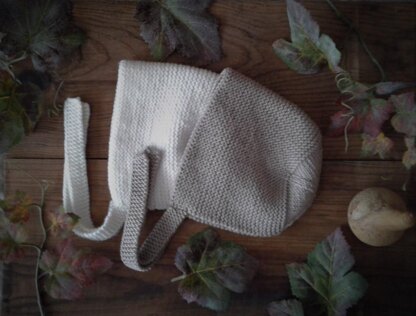 The bonnet is worked in garter stitch, in one flat piece from the casting on edge and working towards the back of the bonnet, where it has a soft shaping, in stockinette stitch, for a close fit, ending with a small back seam.