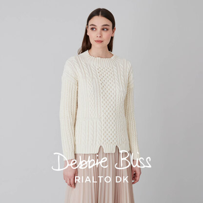 The Crieff Sweater from Debbie Bliss is a striking cabled pullover with dropped shoulders, a crew neckline, and a split front hem. This beautiful sweater is a wonderful spin on the traditional cabled sweater. It is a garment that will easily pair with everything from jeans to work slacks with ease, bringing a little elegance to your everyday wardrobe. Rialto DK yarn is a soft and springy Merino wool yarn with a cable-plied structure that makes texture and cables pop. The Crieff Sweater is knit flat in pieces from the bottom up and seamed. The cable patterns are in written form only.