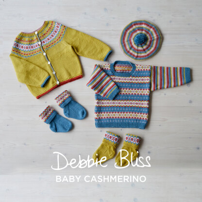 Debbie Bliss Fairground Fairisle Set is a gorgeous baby and child’s layette collection in a lovely Fair Isle pattern knit in Baby Cashmerino. The collection features a lovely yoked cardigan, pullover with striped sleeves, a striped tam, and two pairs of socks with a Fair Isle pattern on the cuffs. This soft blend from Debbie Bliss Baby Cashmerino is perfect for baby and children’s items or anything you want blissfully soft fabric against the skin. Baby Cashmerino is machine-washable, so no need to fear knitting something for the new baby! The Fair Isle patterns are in chart form only.