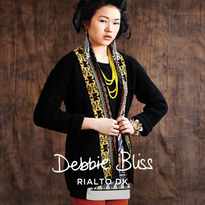 A vibrant selection of Fair Isle patterns in the border, as though in a Persian rug, contrasts dramatically against the body and sleeves of Debbie Bliss’ Jacket with Pattern Border worked in rice stitch in Rialto DK. This sweater is great for the office or dressing up jeans. Debbie Bliss Rialto is an extra-fine Merino that is a dream to work with. The Fair Isle border pattern is in chart form only.
