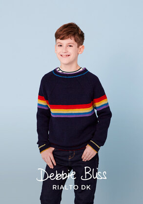 Debbie Bliss Rae is an awesome pullover with colorful stripes kicking the fun up a notch. This kids' sweater is perfect for customizing with your kiddo's favorite colors, and the contrasting stripes on the trims give additional pop of color to this garment. Rialto DK is a soft, machine-washable Merino wool yarn with a crisp stitch definition and a wide color range that makes it easy to make sweaters kids will love. Rae is knit flat in pieces from the bottom up with raglan shaping and a crew neckline. Perfect for school, home, and any adventures that come their way, Rae is a versatile sweater ready for busy kids.
