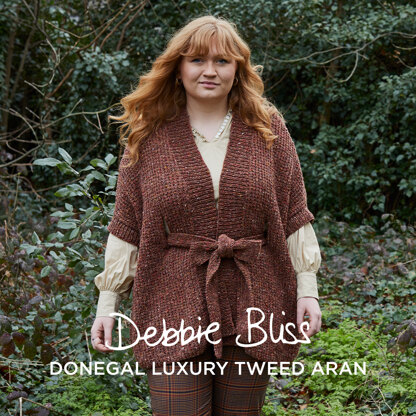 The Debbie Bliss Sleeveless Jacket is a stylish layer that shows off Donegal Luxury Tweed Aran to its best advantage. This single-ply wool yarn has contrasting color flecks spun into it to give it that extra bit of interest and amp up its traditional tweed look. Don’t let the chic look deceive you, this jacket is really a wearable blanket that will keep you warm and cozy from the couch to the office in disguise! Jacket is knit flat in pieces from the bottom up with belt pass-throughs worked in for an effortless closure. Ribbed trims are added to provide a clean finish and a knitted belt adds a gorgeous finishing touch. From fall through spring, the Sleeveless Jacket will be the perfect go-to layer anytime the temperature dips!