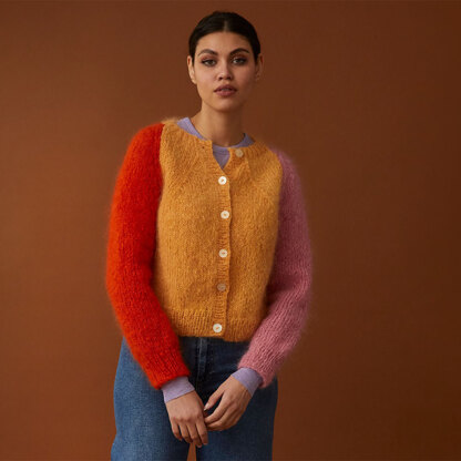 work up in a fluffy flash on large needles. The cardigan features a crew