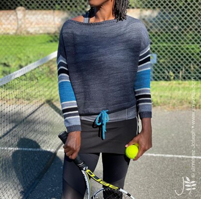 Decathlon is a wide fit, cropped pullover with five colour stripe sleeves. It has a folded casement hem with a pop-colour I-cord rope running through it. A lightweight and practical top for any casual or sporting occasion. This top is knitted flat from the bottom up. The body is worked up to the shoulder contours, which have a slope using short rows. The sleeves are worked flat from the bottom up incorporating bold colourful stripes. The tie cord is made using an I-cord maker, or can be made using the twisted braid method. Links to tutorials are in the pattern.