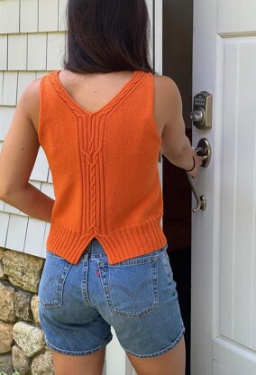 The cable-accented V-neck, angled armholes and split back hem flatter many body types, and the wide ribbing can be blocked to the same circumference as the body, or allowed to pull in slightly, accenting the waist. Even though Della Mae is worked in a sock weight yarn, its slightly cropped length and shaped armholes make it a relatively quick project, and the cabled accents at center front and back keep the knitting process interesting, without requiring constant attention.