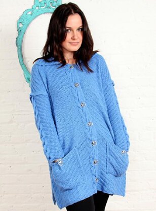 This chic sweater has a really great texture with cables up the back, arms and front. With open sides, the silhouette is very unique and interesting. A very fun knit to add you your project list!