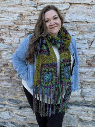 The Directionally Challenged Scarf features 8 large Granny Squares crocheted using self-striping yarn to ease the pain of hiding all those loose ends! It is connected using rectangles with the Arrow Stitch weaving its way along these colorful squares, finishing with multi-colored tassels to give it that genuine Boho flavor!