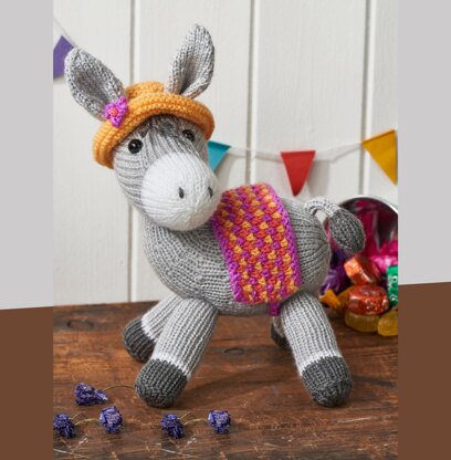 Doris the Donkey is ready for a day at the beach in their floppy sun hat and colourful saddle blanket. This pattern short row shaping for the donkey, and k1b (knit one below) for the saddle blanket pattern. Designed by Amanda Berry @fluffandfuzz, the donkey and accessories are knitted in acrylic DK yarns on single pointed needles (not in the round). For confident beginners and above, other techniques used include casting on and off, knits, purls, increases and decreases, and seaming to finish. Doris stands at 26cm tall.