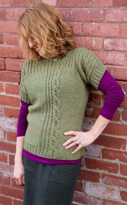 A slightly dropped sleeve, traditional waist shaping and a vertical cable for a flattering line did the trick. Details along the shoulder draw the eye up and give the dolman effect without all the extra fabric, while an elegant cable down one side accents your curves instead of hiding them. Short sleeves balance the silhouette nicely and look great with a fitted tee underneath. Simple construction and lots of hints make this easy to modify for any width or length you think will be flattering on you. You can adjust the ease for either hips, bust or waist as necessary for a custom fit.