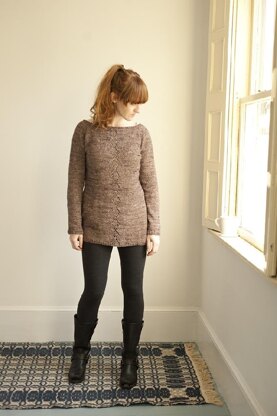 Driftwood features a pretty lace detail that’s simple enough to showcase the beauty of a hand-dyed yarn. Knit with waist shaping to a versatile tunic length, it looks great with leggings or can be the perfect piece to dress up a pair of jeans.