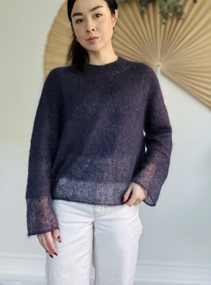 Pullover is worked from the top down almost exclusively in the round. The neckband and the top portion of the yoke is first worked back and forth to create a back opening, and then is joined in the round for the remainder of the yoke. The back yoke is shaped by a small gusset section that is worked back and forth for a better fit. The body and sleeves are then divided and worked separately in the round. Pullover begins with 4 strands of yarn held together, and as the pattern progresses, one strand of yarn is removed until only one strand remains to create a gradient effect of sheerness.