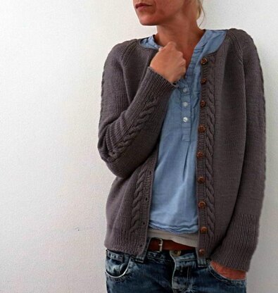 Dustin is a cute, textured cardigan worked seamlessly from the top down. To add interest there are cables on the sleeves and the front of the cardigan which is reminiscent of cute Bavarian jackets. After sleeve stitches are placed on hold the slightly oversized body is worked first down to the ribbing. Additional cables are worked at both sides of the body. Stitches are then picked up for the button band and the buttonhole band. Neck finishing is worked next. Last the sleeve stitches are placed back on the needles to work the sleeves seamlessly in the round down to the cuffs.
