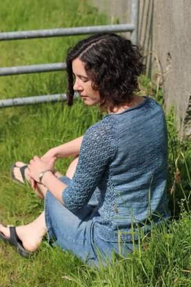 Knit from the top down with raglan shaping this sweater has a delicate lace pattern flowing down the sleeves in contrast to the simple knit body. Gentle waist shaping and ¾ length sleeves make this an easy and elegant sweater to wear.