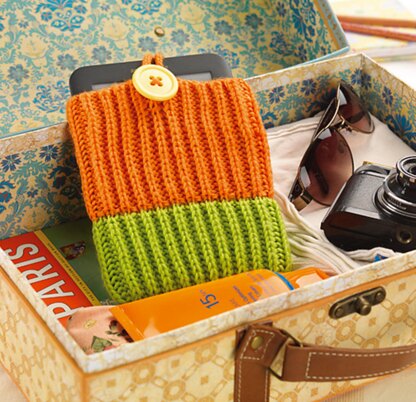 This gadget cover is worked in fisherman’s rib, which is a chunky rib pattern to give your device extra padding. Designed to fit a Kindle e-reader 16.5cm x 11.5cm, or similar sized device. For confident beginners and above, other techniques used include casting on and off, knits, purls, k1b (knit one below), and seaming to finish. Designed by Amanda Berry @fluffandfuzz, the cover is knitted in acrylic DK yarns on single pointed needles (not in the round).