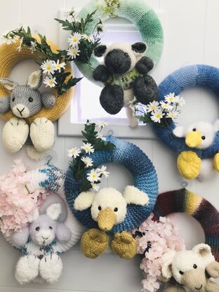 At first I was thinking these would be nice for children’s bedroom doors at Easter. And then I thought perhaps they would be nice as children’s room decorations. The pattern includes directions for a Duck, Bunny and Lamb. You can play with different adornments, perhaps paper or silk flowers or Easter decorations. Have fun sorting through your stash of fancy yarns and left over decorations. Although I recommend chunky yarn for the wreath cover you could use two strands of Aran/Worsted Weight or two strands of double knit/light worsted weight held together. The finished measurement needs to be 7 inches/17cms wide and 25 inches/64cms long to find a 25cm diameter ring. Really anything goes! As with all my designs these are knitted flat and assembled. I have included a very detailed making up guide to help you which is full of photos, hints and tips. I have also included links to various yarns suggestions and where to purchase the polystyrene rings.