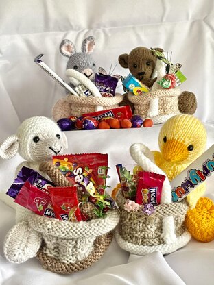 These delightful characters and baskets are knitted flat on two needles. There are two basket designs to choose from. The character measures approximately 6 inches/15cm, the basket is approximately 4 inches/10cm (not including the handle) and are 4 inches/10cm diameter across the bottom of the basket.