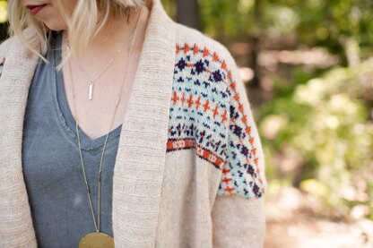 Boxy, graphic drop-sleeve cardigan is engineered from the top down with steeked front and armholes. Sleeves are picked up and knit from armhole steek and collar is worked in one piece at center front opening. Hem Ribbing is accentuated with a squishy cable. Sleeve cuffs are extra long for a folded layer of bonus cozy. Colorwork and cables motifs are charted. Pattern is written for intermediate level knitters ready to dive in to steeking; basic steeking instructions are provided along with links for further information. Model is wearing Size 3 with approximately 18”/45.5 cm positive ease; recommended ease is 15-20”/38-51 cm for oversized look as shown or less for a more fitted style. To Fit guidance is provided and though a variety of sizes is given to choose from; a wide range of bodies fit can beautifully into the same size sweater at varying levels of ease. Make sure to use a feltable, steekable wool for your project.