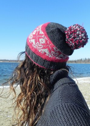 Echo Song is a colorwork slouch hat with a bit of an optical illusion. Look at it one way and snowflakes appear; look at it another and you’ll see diamonds and hearts.