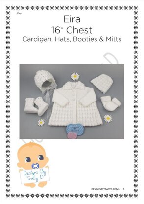 Eira is a Baby Knitting Pattern for a matinee jacket, bonnet or beanie, mitts and booties. It will fit a baby 18" chest and is made using DK yarn.