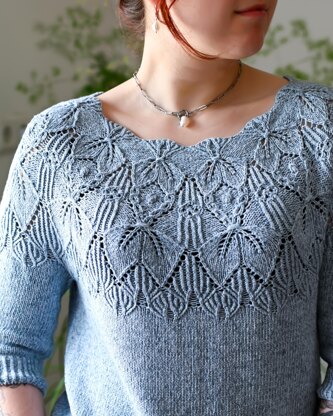 The yoke features a graceful lace motif reminiscent of icy foliage, gently unfolding into clean, comfortable lines. With its flattering shape and serene details, Eisla is a soothing knit and a timeless wardrobe piece.