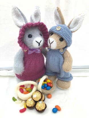 Elderberry Bunny measures approximately 10 inches/28 cms from foot to top of the head, not including ears. The feet, legs and body are knitted in one piece. Head, ears, arms and tail are knitted separately and sewn on. All pieces are knitted flat and assembled, assembly guide is included. Pattern directions include: Elderberry Bunny; dress; bonnet; dungarees; hat and basket.