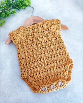 This cute little romper is crochet from the top down. There will be one button at the back of the neck to fasten and three buttons for the crotch.