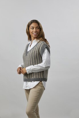 [Elin][1] from Valley Yarns Designer Series is a sophisticated women’s vest knit in [Northfield][2]. This perfect layering piece is sure to have heads turn! [Elin][3] features a deep v-neckline, dropped shoulders, and a fashionable textured slip stitch pattern. The vest is knit flat in pieces and then seamed. The neckband and armbands are picked up along the neck and armhole edge and worked in the round. The ladder slip stitch pattern is in written form only.