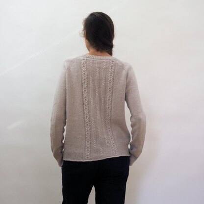 ELIN is worked seamlessly from top down, with raglan increases and a soft ‘A’ line shaping. Until V-neck shaping is done, the sweater is worked flat in rows, then in the round. The cable pattern on the back is nice and easy to knit.