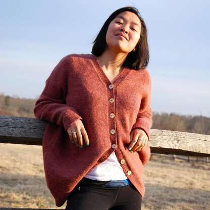 FINISHED MEASUREMENTS (oversized at bust, fitted below hip) Chest: Buttoned 50 (57 ½, 66, 73 1/2, 82)"/ 127 (146, 167.5, 186.5, 208.5)cm Length: 29 (30, 31, 32, 33)"/ 73.5 (76, 78.5, 81.5, 84)cm
