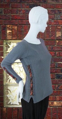 Very feminine without frills, this top down raglan pullover will be a graceful addition to any wardrobe. It can be made with or without the ribbon lacing at the sides and sleeves, but is easy to personalize by changing up the colors. After working a 3-rnd neckband in seed stitch, the raglan shaping begins, along with short-rows to shape the front neck. Worked mainly in stockinette, this piece knits up quickly, including waist shaping. Simple lace panels are added at each side of the body which is divided above the seed stitch hem to work a short slit. The sleeves are worked in the round with a narrower version of the lace panel worked at the center of each sleeve. Below the lace panel, a few stitches are increased for a slight bell shape to the cuff before working the cuff in seed stitch. To finish, use a ribbon or ribbon yarn to thread through each of the lace panels. Make sure to use a ribbon without wire edges.