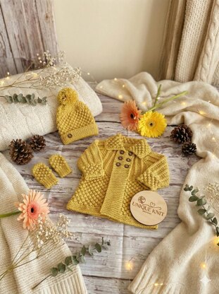 A beautiful 3 piece coat set, knitting pattern which is ideal for either a boy or girl. The Coat is knitted flat from the top down on straight needles and the button bands are worked as you go, so no awkward picking up of stitches is required to make this coat set. The pattern has line-by-line instructions so you don't need to do any workings out. With minimal sewing required this set knit up quickly, the bobble hat and mittens are also easy to do.