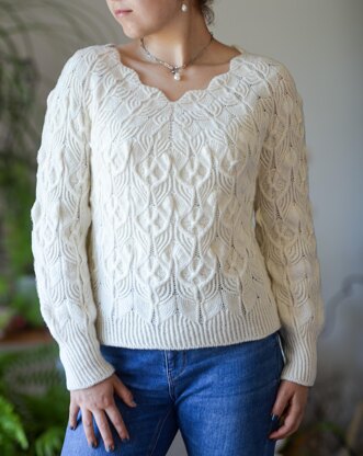 Crafted with DK weight yarn, this sweater features a striking scalloped V-neck that catches the eye and adds a touch of elegance. The body and sleeves are adorned with an intricate pattern of twisted and wrapped stitches, creating a beautifully textured fabric that’s as fun to knit as it is to wear.