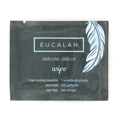 One Eucalan-saturated towelette, individually packaged for your on-the-go emergencies. Simply blot or rub the wipe on the affected spot for stain treating and garment freshening. One wipe per pack.