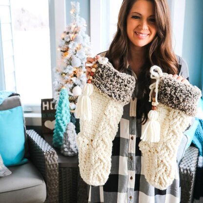 Soft and cozy cable stitch crochet Christmas stocking pattern works up quickly in super bulky yarn and fable fur. The pattern also includes a free tutorial on YouTube.