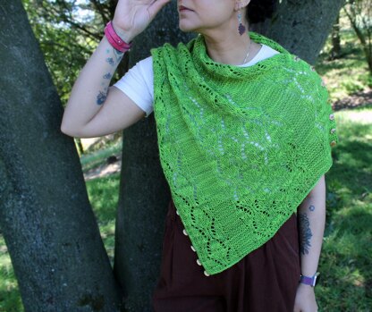 Inspired by beautiful Fallen Leaf Lake in the Sierra Nevadas, this versatile accessory incorporates an intricate repeating lace pattern that mimics falling leaves. Buttons on opposing sides allow it to be worn as a shrug, a poncho, a cardigan or a cowl. The perfect accompaniment to a chilly evening.