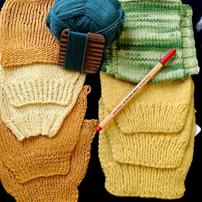 Needles in the sizes used to knit homework, plus needles 2 and 4 sizes smaller and 2 sizes larger.