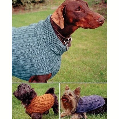 A trio of dog sweaters featuring ribbed patterns to provide thermal warmth as well as a good fit. Choose from Beaded Rib, Hearts Rib, or Mock Cable Rib pattern stitch. Top the sweater with a turtleneck, or one of the neck variations. These sweaters work up quickly in worsted weight yarn and are designed to fit a large variety of dogs.