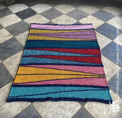 Fishing For Koi is a colourful throw/blanket that is made using DK weight yarn held double stranded (or a single strand of Aran or Bulky weight yarn) and up to Ten colours. A cosy blanket with garter stitch short rows that angle and balance left and right, giving it a dramatic appearance, as well as fun colour-changing possibilities.