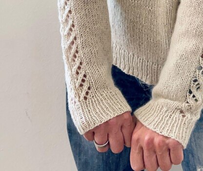 Fjolla is worked seamlessly from the top down, with 2 strands of mYak Baby Yak Lace held double throughout. The yoke is shaped by using a modified version of the contiguous set-in sleeves method developed by Susie Myers. First the yoke is worked back and forth to the final neck CO. When the neck shaping is complete, the yoke is worked in rounds to sleeve separation. The sleeve stitches are placed on hold and the underarm stitches are cast on. Then the body is worked in rounds to the ribbing. The sleeve stitches are then picked up again to work the sleeve in rounds, top down, to the cuffs. Neck finishing is worked last.