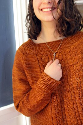Flor de Jerez - the sweater, was designed to highlight the subtle differences in the deep shades of apricot and pumpkin in this yarn, using simple contrasting textures - stockinette, garter, ribs, and cables.