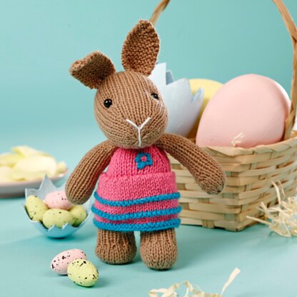Little Flora the Bunny has their best dress on, ready for an Easter picnic. This toy is worked mostly in stockinette, with increases and decreases for shaping. Designed by Amanda Berry @fluffandfuzz, this bunny is knitted in acrylic DK yarns on single pointed needles (not in the round). For confident beginners and above, other techniques used include casting on and off, knits, purls, increases and decreases, and seaming to finish.