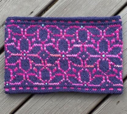 I wanted to design a pretty all-over pattern to put on a hat, cowl, mittens and maybe a pillow too! Here it is and the prototype was such a favorite in my most recent knit design class, I decided to publish the cowl first. The design needed to be simple, easy to knit, but striking. This simple, geometric floral arrangement works nicely. A tonal or space-dyed yarn in pinks creates the subtle color changes and achieves the desired result BUT if stash-busting is on your mind, alternate 2 different shades of pink (or color of knitter’s choice) every other round, and a tonal effect is achieved without tonal yarn!