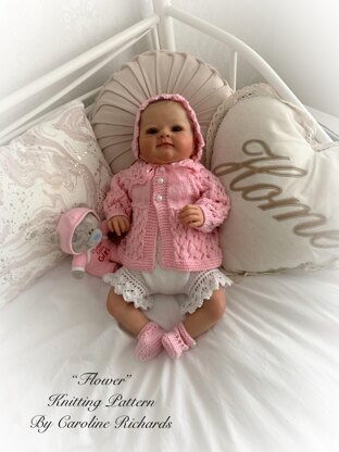 The pattern provides the instructions to make a collared cardigan, bloomers, bonnet and shoes. The top is knitted from the collar down on straight needles, all in one piece, so little sewing required. My Patterns give line by line instructions, so are very easy to follow. The sizes are dictated by the wool and needles used