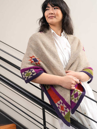 Calling all intarsia lovers! This triangle shawl is worked from the top down and sprinkled with quilt-inspired star motifs, finishing with a bold, colorful border.