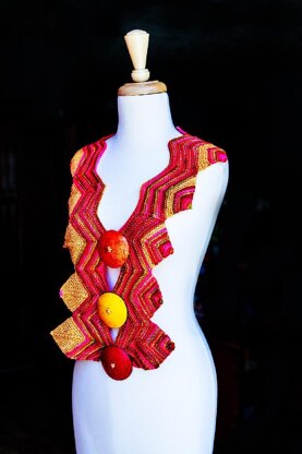 A dozen mitered squares are knit individually then joined with a ripple stitch pattern to create this fun accessory that is not quite a scarf, yet not quite a sweater. Or ditch the buttons and wear it as a scarf. Combine your favorite solid and variegated yarns for custom results. Once you get the set-up rows accomplished, it becomes rhythmic knitting that allows you to ditch the pattern.