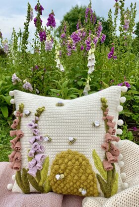 You can have a beautiful English cottage garden all year round with my Foxgloves and Bees cushion. Set against a simple plain background these statuesque flowers stand tall and strong and can be made in whichever colours you choose. The cushion cover is worked in rows of dc ( UK terms) and the foxgloves, hive and bees are made separately and stitched on to the finished cover. The cushion has a simple overlap opening on the reverse.