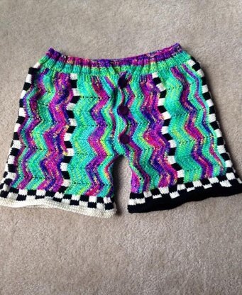 Who does not want a wonderful pair of knitted boxers. This was done for a Stitches show Done side to side, it works quickly, changing colors and adding the Black and White domino makes it a great fun project. Yardage is per skein, so the total is high, but you really do not need all of it, especially for the black and white. You can make 2 pairs Size is for a 40 inch hip, but can be adjusted with the waistband by making it tighter